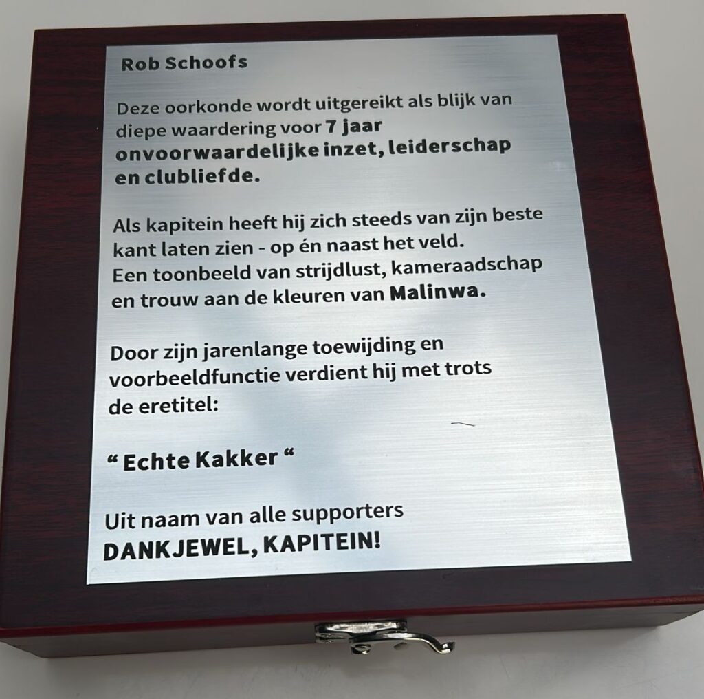 Met 282 wedstrijden, 49 assists, 44 doelpunten en 8 jaar pure inzet, passie en trouw heeft Rob een onuitwisbare stempel op onze club gedrukt. Na de degradatie bleef hij zonder aarzelen, hielp hij mee aan de promotie én pakte hij de beker – een man met een echt Malinwa-DNA, het type speler dat we als supporter moeten koesteren. Zondag geven we hem daarom een warm welkom Achter De Kazerne én een speciaal supporterscadeau en… geven we hem een speciale oorkonde vanuit de supporters: